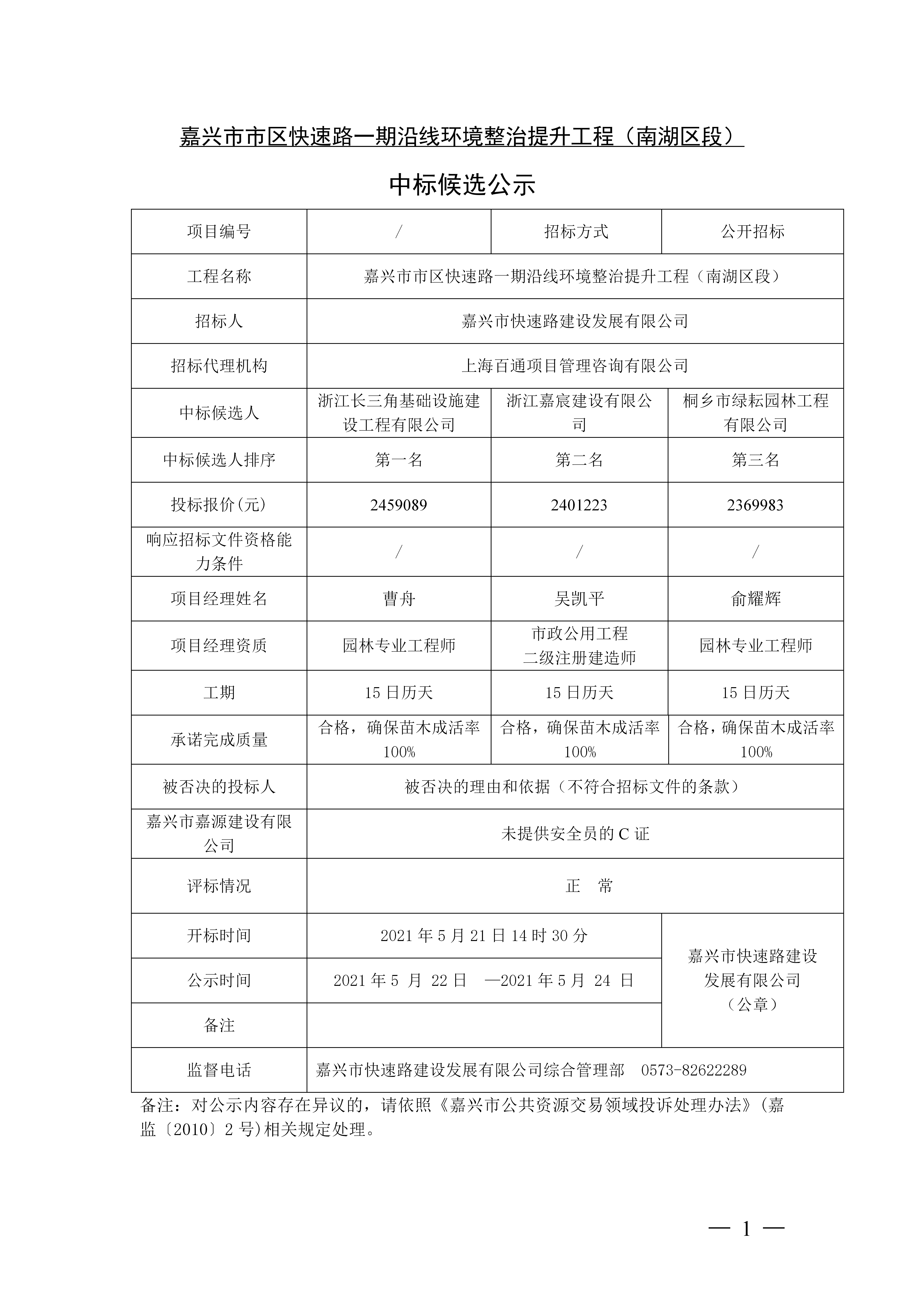 嘉興市市區(qū)快速路一期沿線環(huán)境整治提升工程(南湖區(qū)段) 中標(biāo)候選公示